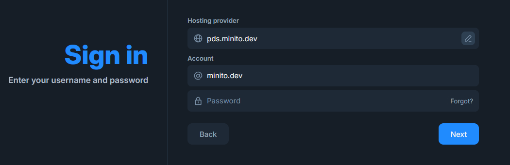 Since I am my own hosting provider, I put pds.minito.dev instead. This means that my data and identity are under my own control. Even if Bluesky were to ban me, my data and identity remain untouched, and I can continue to use other sites that I have used this SSO to log in with.