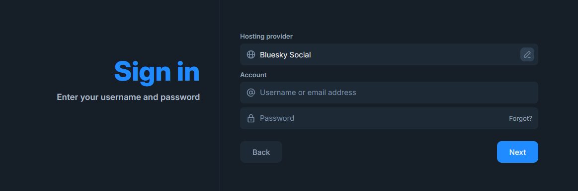 You probably didn't think twice about the "Bluesky Social" hosting provider. You're logging into Bluesky, so "Bluesky Social" makes sense. However, there is more to this. The "hosting provider" is essentially who owns your account. When you created your account on Bluesky, your new account now exists in one of Bluesky's data servers. However, Bluesky does allow alternate Hosting Providers to exist and sign into Bluesky. I run my own data server and this is what my login page looks like: