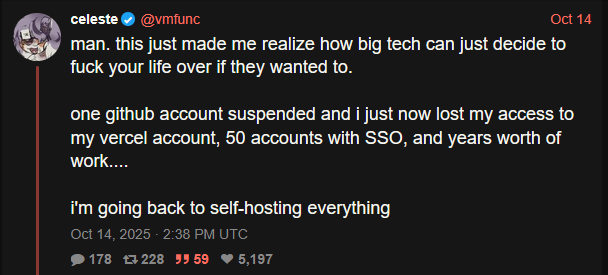 Because this person used their Github account as their identity, getting banned on Github meant losing access to ALL accounts that relied on that single log in, creating a single point of failure. This single point of failure becomes even worse with the reality that these sites do not have proper moderation, an issue that plagues most, if not all, social media. This combination of issues turns your internet accounts into a house of cards, that you may be adding to every time you decide to log in using one of those buttons.